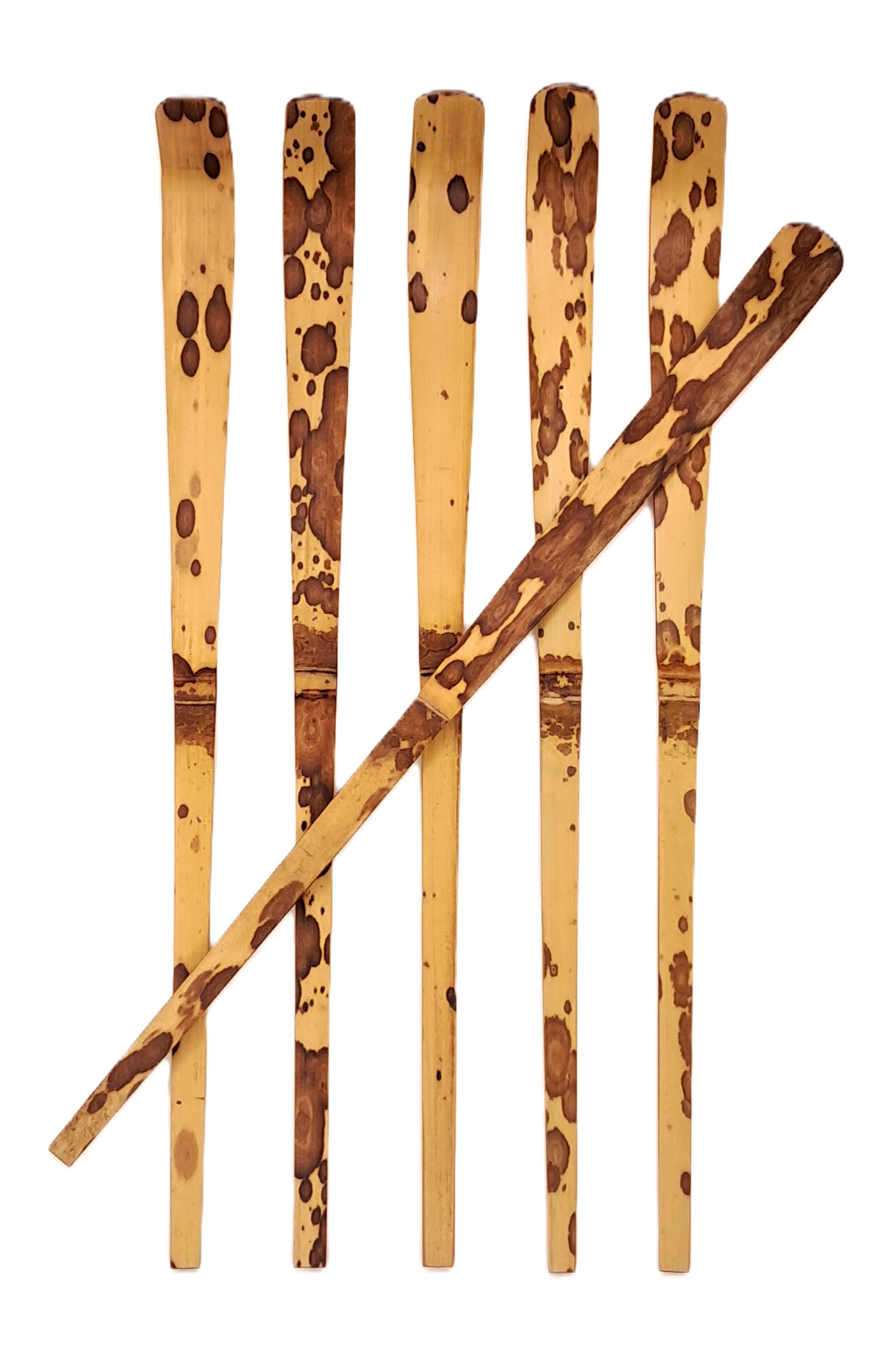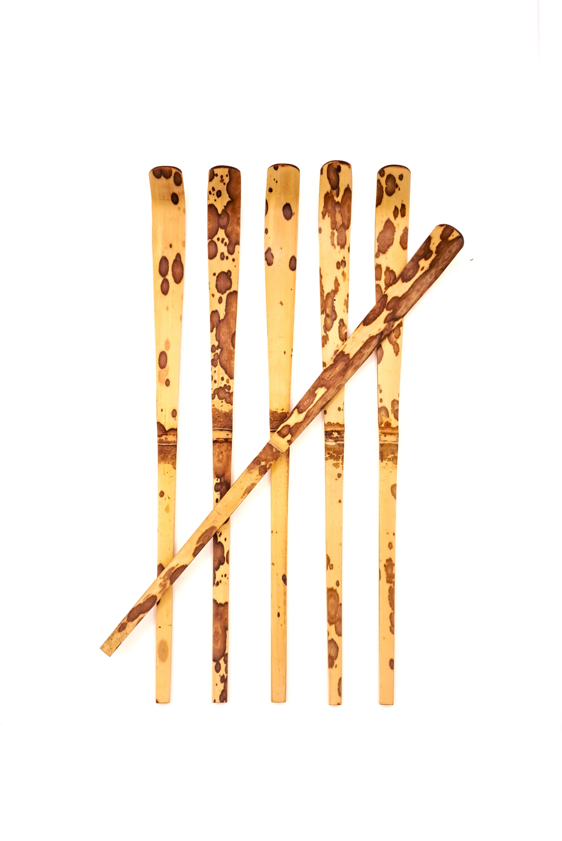 Bambuslöffel für Matcha-Pulver. Unregelmäßige Flecken wie Tropfen auf dem Bambus.